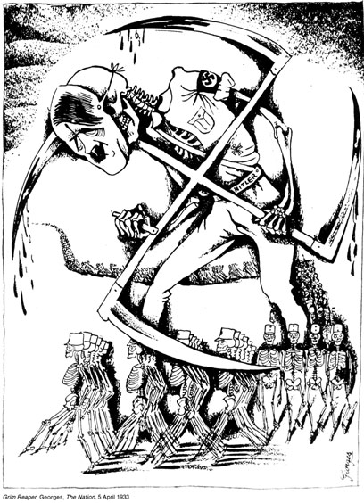 1933. This cartoon is from The Nation in 1933, from a time when The Nation could still recognize (some) existential threats to liberty. No, it's not the most subtle work in the world, but that's not the point. The point is that there were those who saw what Hitler was, saw it early, and spoke out, and it still didn't stop him. Consider the effect that these cartoons might have had, and then consider the effect of not having them at all. And then go take another look at those Danish cartoons.